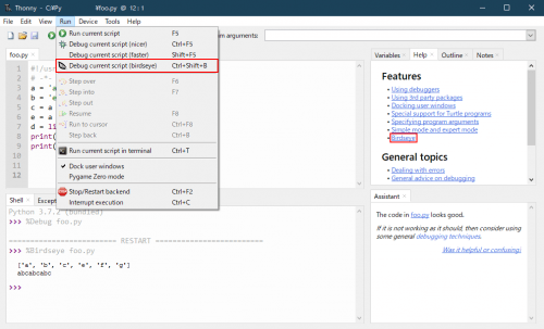 Thonnyから「Run>Debug current script(birdseye)」を選択すると、現在、開いているスクリプト(ここの例では「foo.py」)を直接デバッグできます。birdseyeのインポート文、@eyeデコレーターも書込みしなくても良いので簡単で便利だと思います。