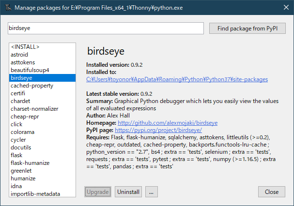 Thonnyは初心者向けのPython IDE(統合開発環境 Integrated Development Environment)です。前回に説明したデバッグ以外にThonnyでbirdseyeというPythonデバッガーが使用できるようです。birdeyeは、式の値を記録するPythonデバッガーらしいです。私は素人なので雰囲気だけ記載します。