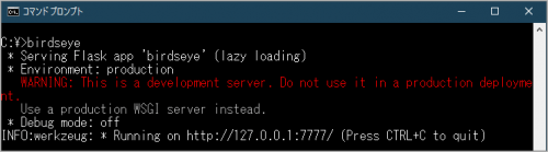 以下の例ではプロンプトがC:\になっています。「birdseye」を実行します。