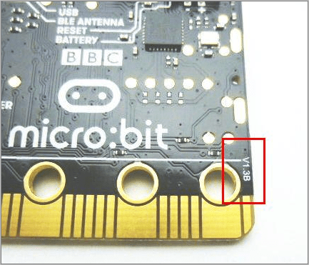 先ず、使用しているmicro:bitのバージョンを調べます。現在の種類はV2、 V1.5,、V1.3b、V1.3があるそうです。ファームウェアはfor V1かfor V2です。最新のV2はスピーカー、マイク付きです。micro:bit裏面の基板の右下にバージョンがプリントされています。ここで見分けるのが確実です。私のmicro:bitはやっぱり古いのでV1.3Bでした。