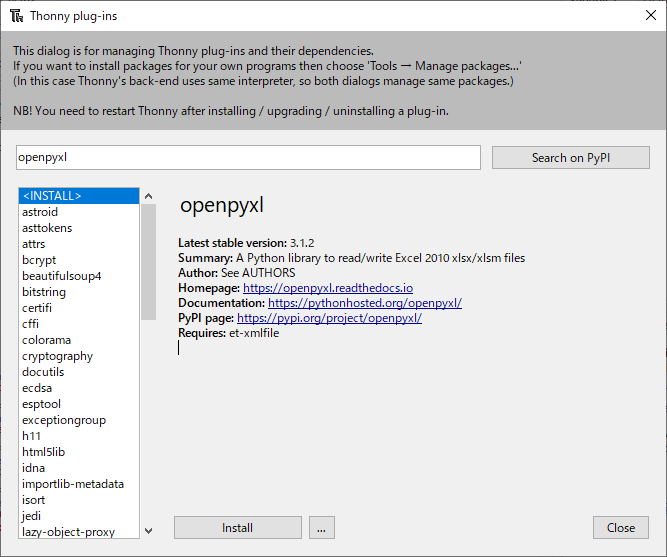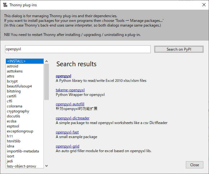 検索結果が表示されます。一番、上の「openpyxl」を選択します。