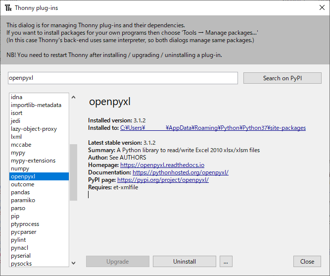 開発環境はThonnyを使用しています。そのためManage plug-insから簡単にpandasをインストールできます。