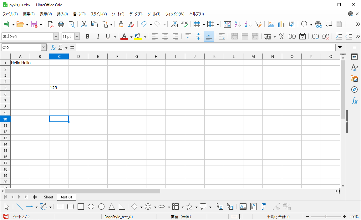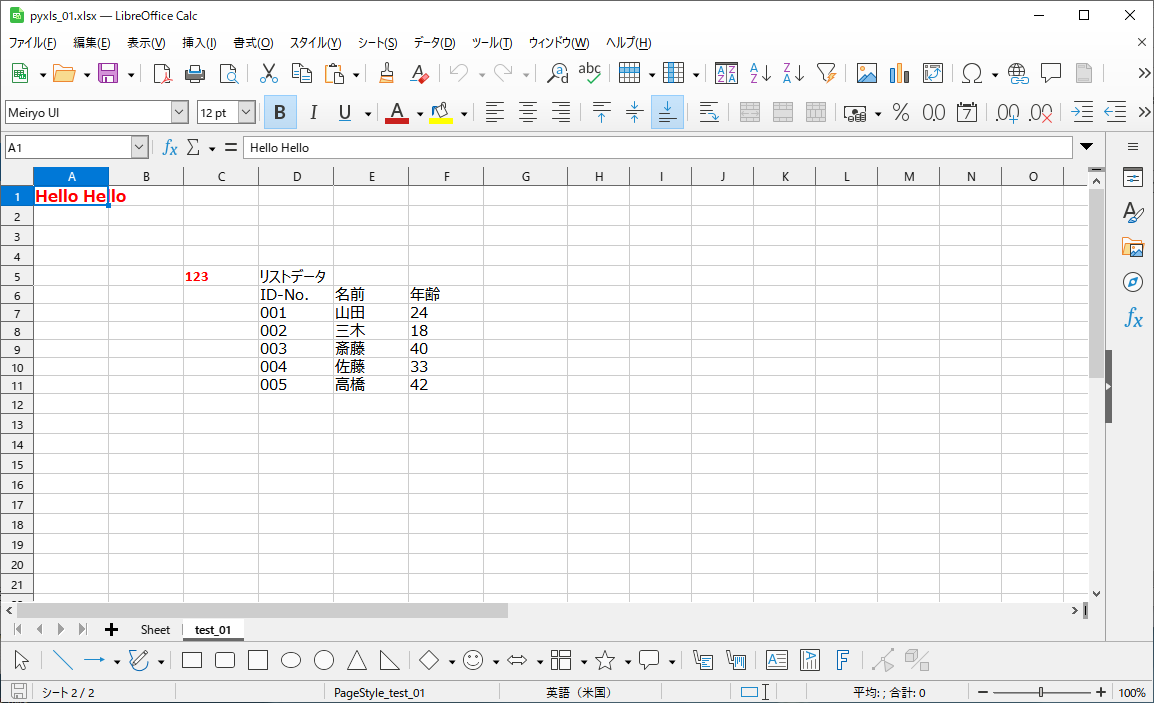 エクセルファイル’pyxls_01.xlsx’のシート’test_01’を確認します。