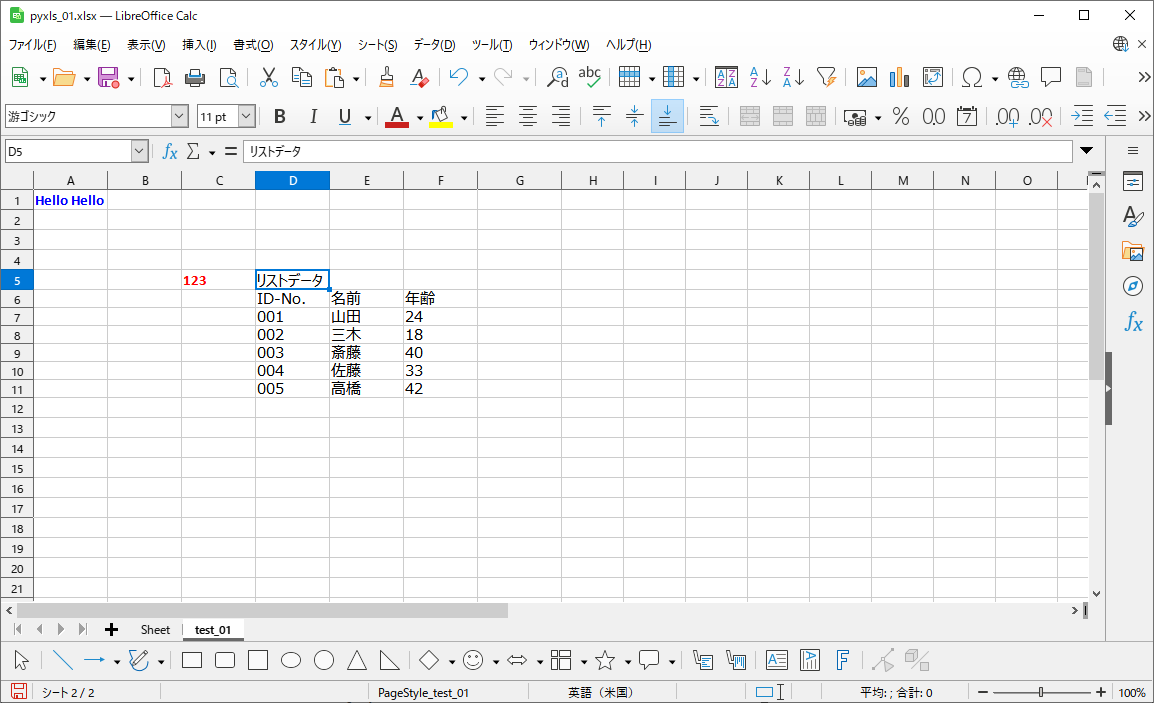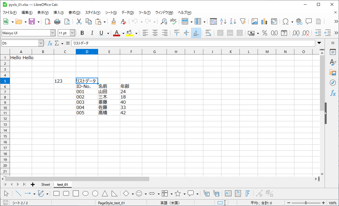 エクセルファイル’pyxls_01.xlsx’のシート’test_01’を確認します。D5から記入できています。